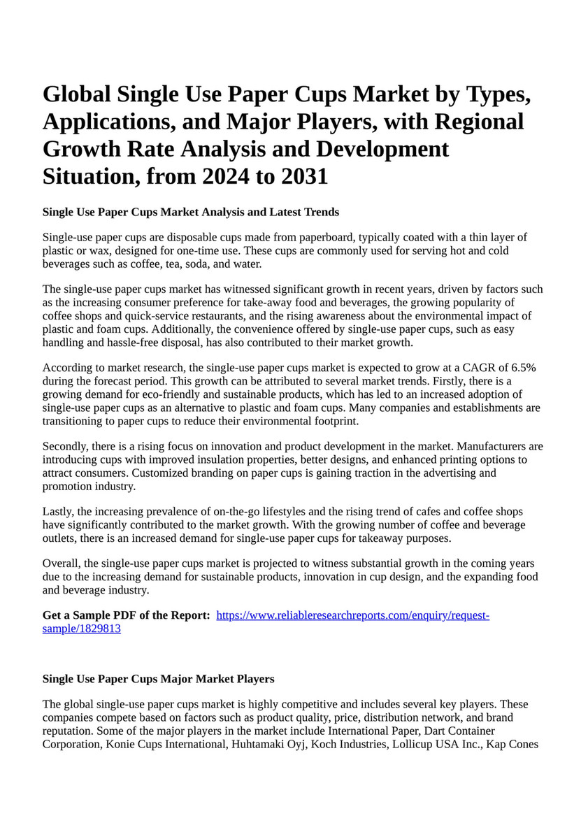 Source : www.facebook.comReportprime Global Single Use Paper Cups Market by Types